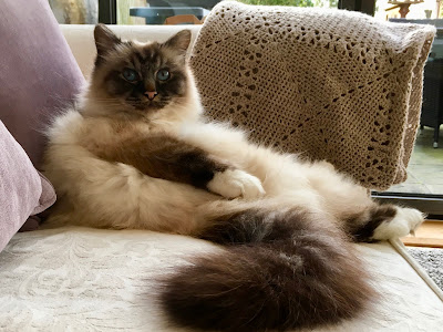 Meanwhile, George also took life easy during the holidays. He either slept in the closet or he watched us from his perch on top of the fridge (above), took up residence on the sofa for a nap or just lounged on a warm lap.